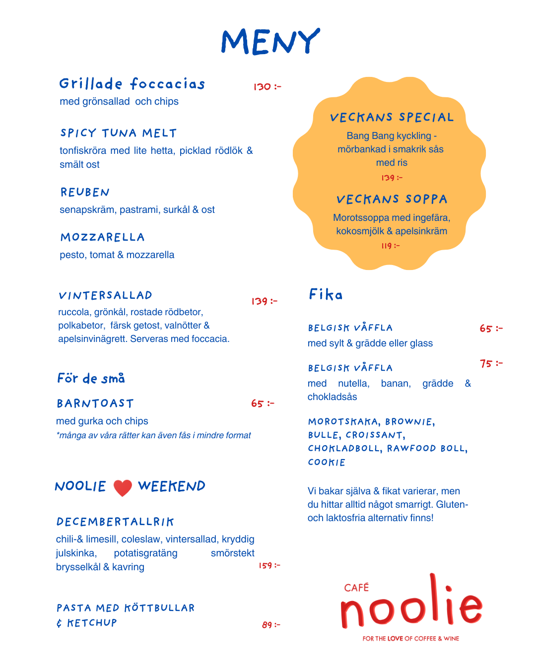 Vi serverar veckans lunch, färgglada sallader, matiga mackor och suktande fika, finkaffe, vin och öl!